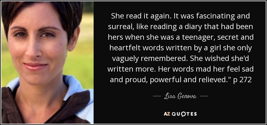 She read it again. It was fascinating and surreal, like reading a diary that had been hers when she was a teenager, secret and heartfelt words written by a girl she only vaguely remembered. She wished she'd written more. Her words mad her feel sad and proud, powerful and relieved." p 272