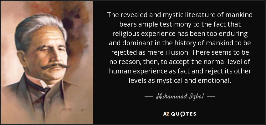 The revealed and mystic literature of mankind bears ample testimony to the fact that religious experience has been too enduring and dominant in the history of mankind to be rejected as mere illusion. There seems to be no reason, then, to accept the normal level of human experience as fact and reject its other levels as mystical and emotional.