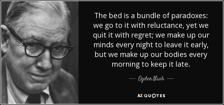 Bed is a bundle of paradoxes: we go to it with reluctance, yet we quit it with regret.