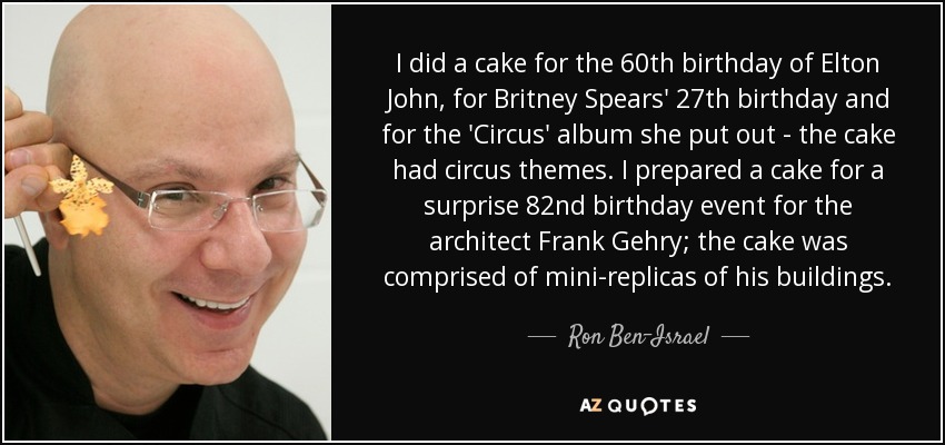 I did a cake for the 60th birthday of Elton John, for Britney Spears' 27th birthday and for the 'Circus' album she put out - the cake had circus themes. I prepared a cake for a surprise 82nd birthday event for the architect Frank Gehry; the cake was comprised of mini-replicas of his buildings.