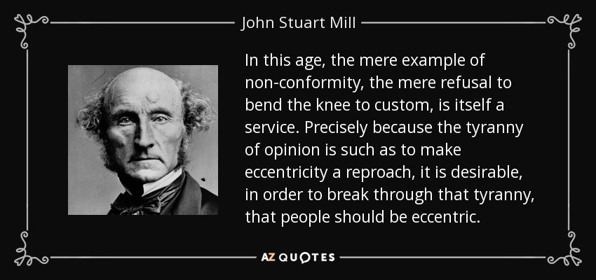 In this age, the mere example of non-conformity, the mere refusal to bend the knee to custom, is itself a service. Precisely because the tyranny of opinion is such as to make eccentricity a reproach, it is desirable, in order to break through that tyranny, that people should be eccentric.