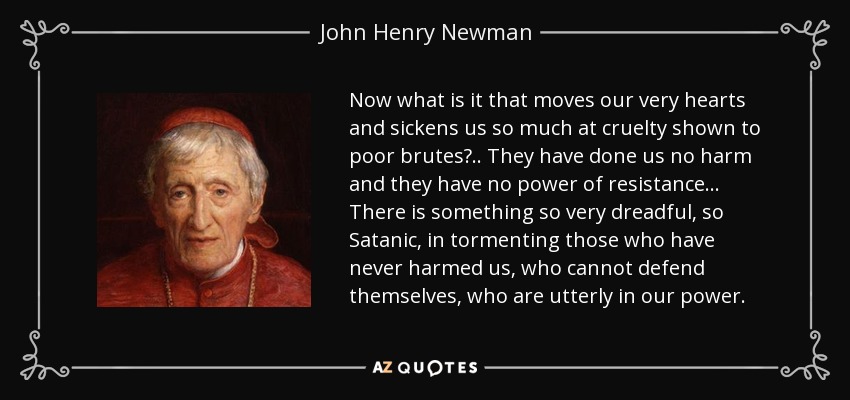 Now what is it that moves our very hearts and sickens us so much at cruelty shown to poor brutes?.. They have done us no harm and they have no power of resistance... There is something so very dreadful, so Satanic, in tormenting those who have never harmed us, who cannot defend themselves, who are utterly in our power.