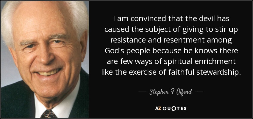 I am convinced that the devil has caused the subject of giving to stir up resistance and resentment among God's people because he knows there are few ways of spiritual enrichment like the exercise of faithful stewardship.