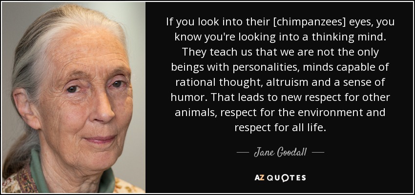If you look into their [chimpanzees] eyes, you know you're looking into a thinking mind. They teach us that we are not the only beings with personalities, minds capable of rational thought, altruism and a sense of humor. That leads to new respect for other animals, respect for the environment and respect for all life.