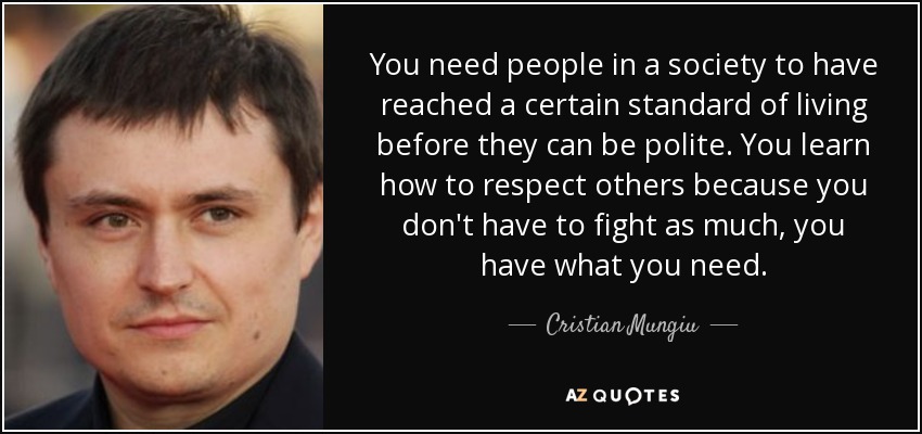 You need people in a society to have reached a certain standard of living before they can be polite. You learn how to respect others because you don't have to fight as much, you have what you need.