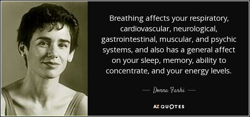 Breathing affects your respiratory, cardiovascular, neurological, gastrointestinal, muscular, and psychic systems, and also has a general affect on your sleep, memory, ability to concentrate, and your energy levels.