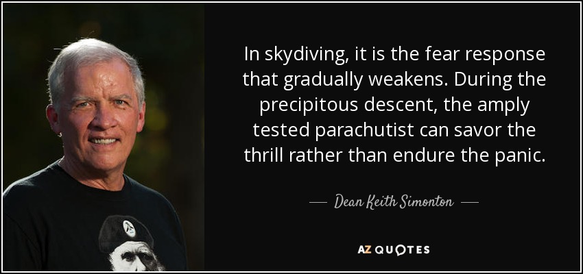 In skydiving, it is the fear response that gradually weakens. During the precipitous descent, the amply tested parachutist can savor the thrill rather than endure the panic.