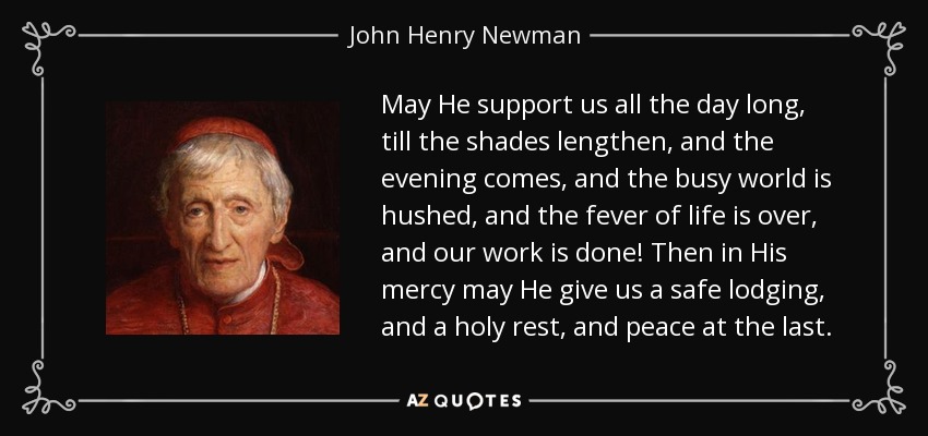 May He support us all the day long, till the shades lengthen, and the evening comes, and the busy world is hushed, and the fever of life is over, and our work is done! Then in His mercy may He give us a safe lodging, and a holy rest, and peace at the last.