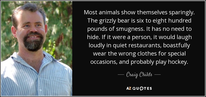 Most animals show themselves sparingly. The grizzly bear is six to eight hundred pounds of smugness. It has no need to hide. If it were a person, it would laugh loudly in quiet restaurants, boastfully wear the wrong clothes for special occasions, and probably play hockey.
