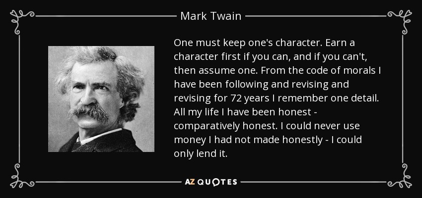 One must keep one's character. Earn a character first if you can, and if you can't, then assume one. From the code of morals I have been following and revising and revising for 72 years I remember one detail. All my life I have been honest - comparatively honest. I could never use money I had not made honestly - I could only lend it.