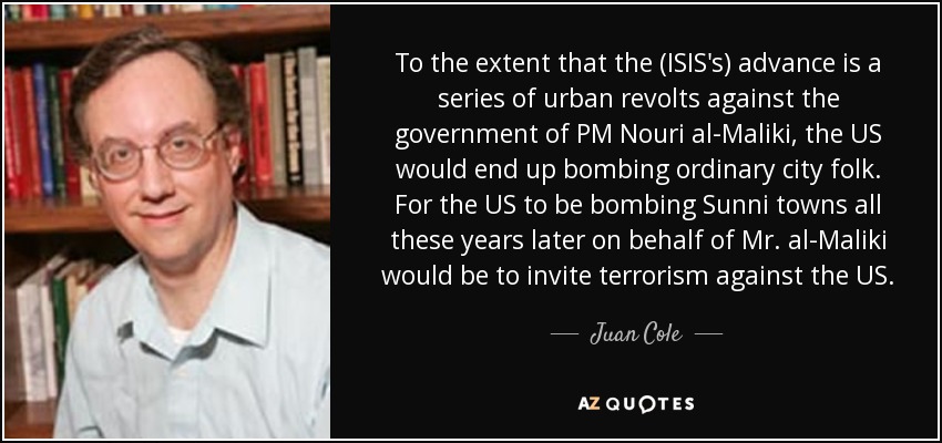 To the extent that the (ISIS's) advance is a series of urban revolts against the government of PM Nouri al-Maliki, the US would end up bombing ordinary city folk. For the US to be bombing Sunni towns all these years later on behalf of Mr. al-Maliki would be to invite terrorism against the US.