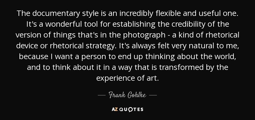 The documentary style is an incredibly flexible and useful one. It's a wonderful tool for establishing the credibility of the version of things that's in the photograph - a kind of rhetorical device or rhetorical strategy. It's always felt very natural to me, because I want a person to end up thinking about the world, and to think about it in a way that is transformed by the experience of art.