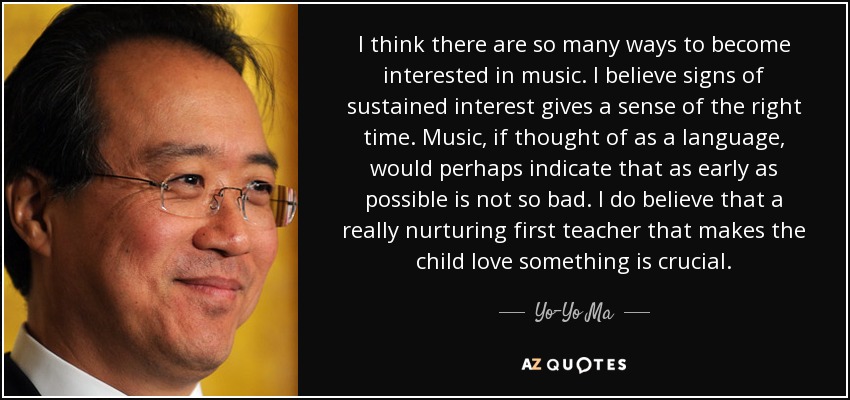 I think there are so many ways to become interested in music. I believe signs of sustained interest gives a sense of the right time. Music, if thought of as a language, would perhaps indicate that as early as possible is not so bad. I do believe that a really nurturing first teacher that makes the child love something is crucial.