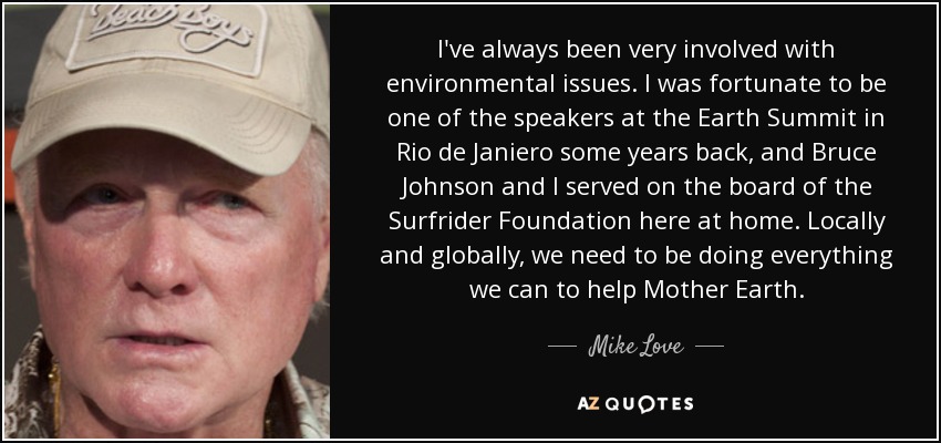 I've always been very involved with environmental issues. I was fortunate to be one of the speakers at the Earth Summit in Rio de Janiero some years back, and Bruce Johnson and I served on the board of the Surfrider Foundation here at home. Locally and globally, we need to be doing everything we can to help Mother Earth.