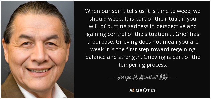 When our spirit tells us it is time to weep, we should weep. It is part of the ritual, if you will, of putting sadness in perspective and gaining control of the situation. . . . Grief has a purpose. Grieving does not mean you are weak It is the first step toward regaining balance and strength. Grieving is part of the tempering process.