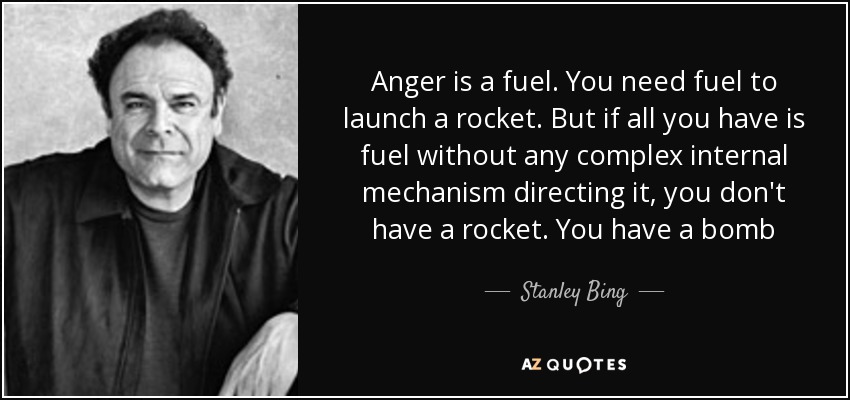 Anger is a fuel. You need fuel to launch a rocket. But if all you have is fuel without any complex internal mechanism directing it, you don't have a rocket. You have a bomb