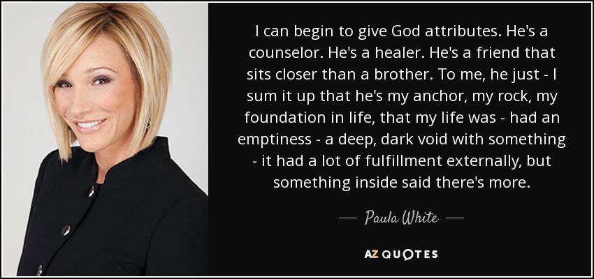 I can begin to give God attributes. He's a counselor. He's a healer. He's a friend that sits closer than a brother. To me, he just - I sum it up that he's my anchor, my rock, my foundation in life, that my life was - had an emptiness - a deep, dark void with something - it had a lot of fulfillment externally, but something inside said there's more.