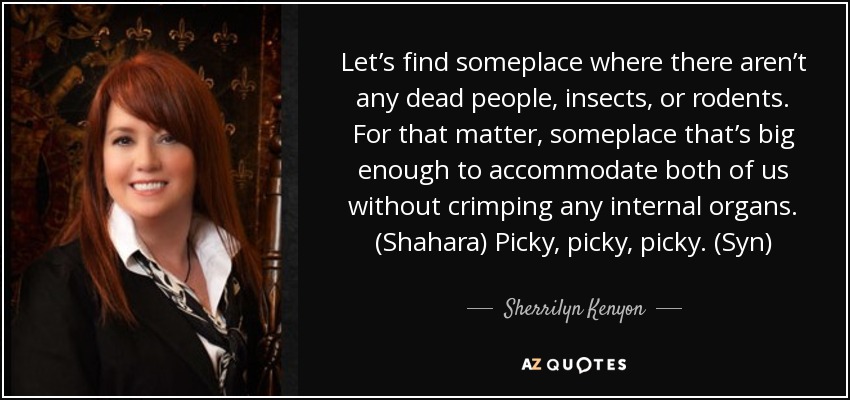 Let’s find someplace where there aren’t any dead people, insects, or rodents. For that matter, someplace that’s big enough to accommodate both of us without crimping any internal organs. (Shahara) Picky, picky, picky. (Syn)