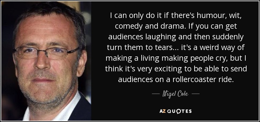 I can only do it if there's humour, wit, comedy and drama. If you can get audiences laughing and then suddenly turn them to tears... it's a weird way of making a living making people cry, but I think it's very exciting to be able to send audiences on a rollercoaster ride.