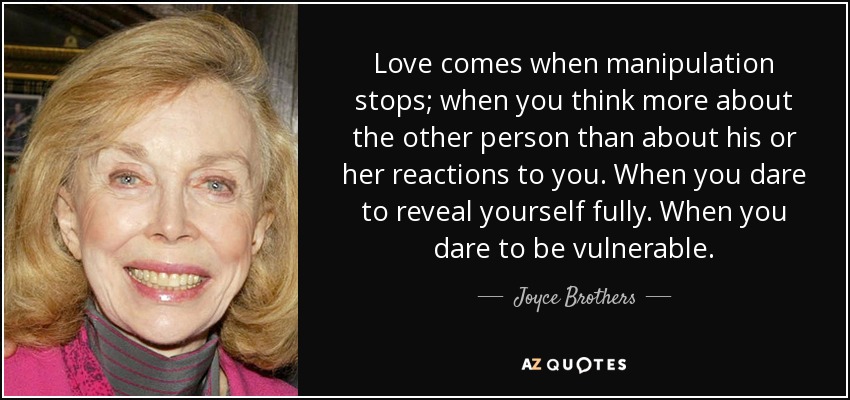 Love comes when manipulation stops; when you think more about the other person than about his or her reactions to you. When you dare to reveal yourself fully. When you dare to be vulnerable.