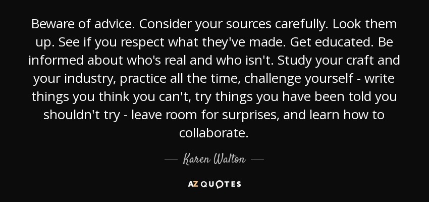 Beware of advice. Consider your sources carefully. Look them up. See if you respect what they've made. Get educated. Be informed about who's real and who isn't. Study your craft and your industry, practice all the time, challenge yourself - write things you think you can't, try things you have been told you shouldn't try - leave room for surprises, and learn how to collaborate.
