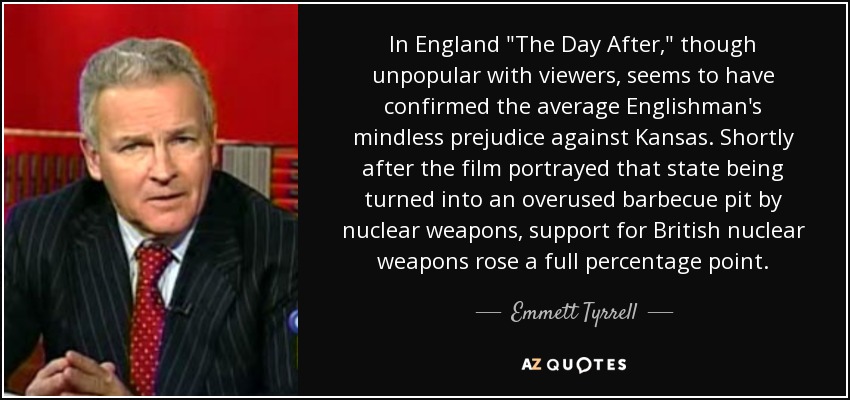 In England "The Day After," though unpopular with viewers, seems to have confirmed the average Englishman's mindless prejudice against Kansas. Shortly after the film portrayed that state being turned into an overused barbecue pit by nuclear weapons, support for British nuclear weapons rose a full percentage point.