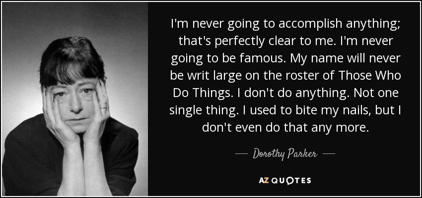 I'm never going to accomplish anything; that's perfectly clear to me. I'm never going to be famous. My name will never be writ large on the roster of Those Who Do Things. I don't do anything. Not one single thing. I used to bite my nails, but I don't even do that any more.