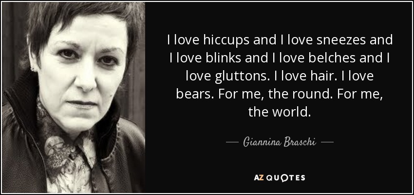 I love hiccups and I love sneezes and I love blinks and I love belches and I love gluttons. I love hair. I love bears. For me, the round. For me, the world.