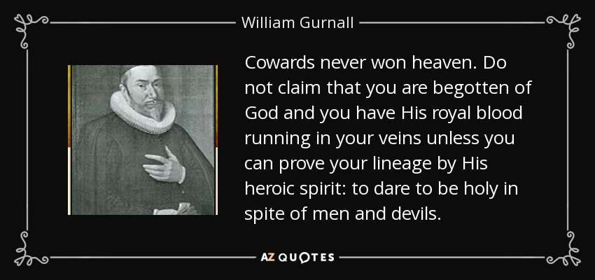 Cowards never won heaven. Do not claim that you are begotten of God and you have His royal blood running in your veins unless you can prove your lineage by His heroic spirit: to dare to be holy in spite of men and devils.