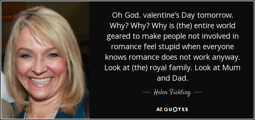 Oh God. valentine's Day tomorrow. Why? Why? Why is (the) entire world geared to make people not involved in romance feel stupid when everyone knows romance does not work anyway. Look at (the) royal family. Look at Mum and Dad.