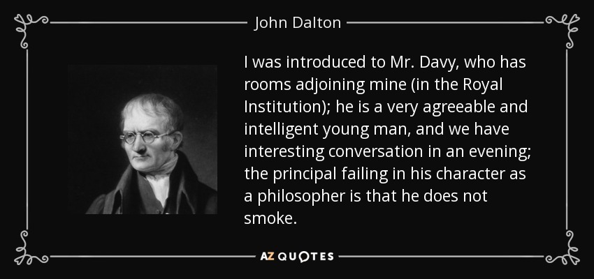 I was introduced to Mr. Davy, who has rooms adjoining mine (in the Royal Institution); he is a very agreeable and intelligent young man, and we have interesting conversation in an evening; the principal failing in his character as a philosopher is that he does not smoke.