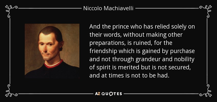 And the prince who has relied solely on their words, without making other preparations, is ruined, for the friendship which is gained by purchase and not through grandeur and nobility of spirit is merited but is not secured, and at times is not to be had.