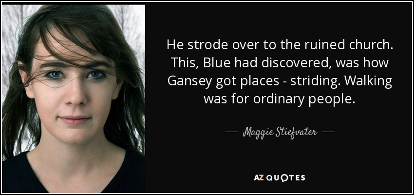 He strode over to the ruined church. This, Blue had discovered, was how Gansey got places - striding. Walking was for ordinary people.