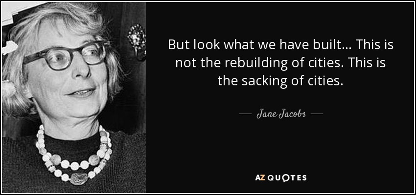 But look what we have built low-income projects that become worse centers of delinquency, vandalism and general social hopelessness than the slums they were supposed to replace. Cultural centers that are unable to support a good bookstore. Civic centers that are avoided by everyone but bums. Promenades that go from no place to nowhere and have no promenaders. Expressways that eviscerate great cities. This is not the rebuilding of cities. This is the sacking of cities.