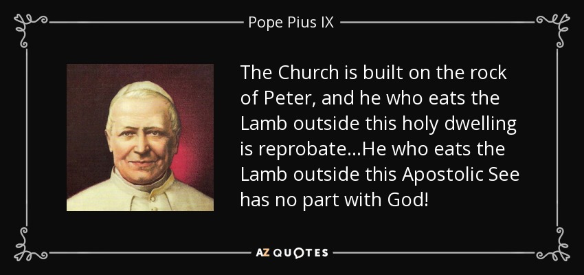 The Church is built on the rock of Peter, and he who eats the Lamb outside this holy dwelling is reprobate .. .He who eats the Lamb outside this Apostolic See has no part with God!