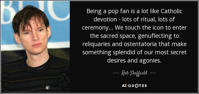 Being a pop fan is a lot like Catholic devotion - lots of ritual, lots of ceremony... We touch the icon to enter the sacred space, genuflecting to reliquaries and ostentatoria that make something splendid of our most secret desires and agonies.
