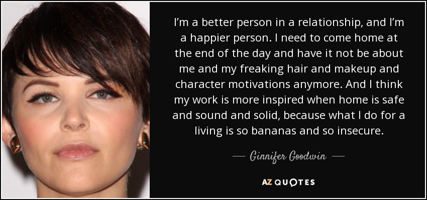 I’m a better person in a relationship, and I’m a happier person. I need to come home at the end of the day and have it not be about me and my freaking hair and makeup and character motivations anymore. And I think my work is more inspired when home is safe and sound and solid, because what I do for a living is so bananas and so insecure.