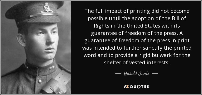 The full impact of printing did not become possible until the adoption of the Bill of Rights in the United States with its guarantee of freedom of the press. A guarantee of freedom of the press in print was intended to further sanctify the printed word and to provide a rigid bulwark for the shelter of vested interests.