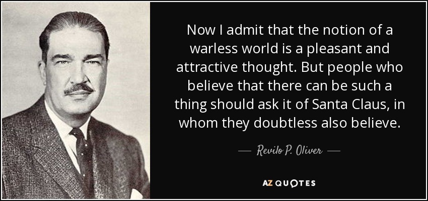 Now I admit that the notion of a warless world is a pleasant and attractive thought. But people who believe that there can be such a thing should ask it of Santa Claus, in whom they doubtless also believe.