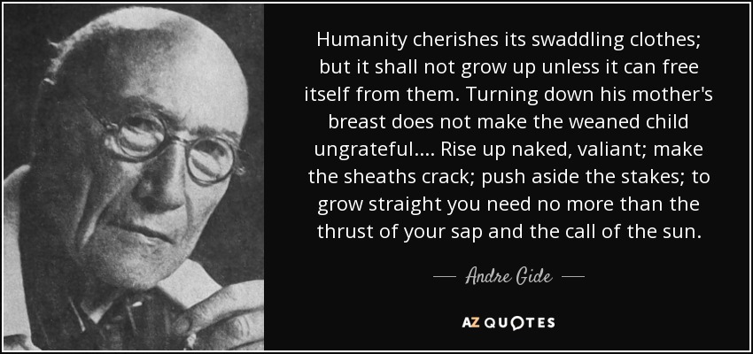 Humanity cherishes its swaddling clothes; but it shall not grow up unless it can free itself from them. Turning down his mother's breast does not make the weaned child ungrateful. ... Rise up naked, valiant; make the sheaths crack; push aside the stakes; to grow straight you need no more than the thrust of your sap and the call of the sun.