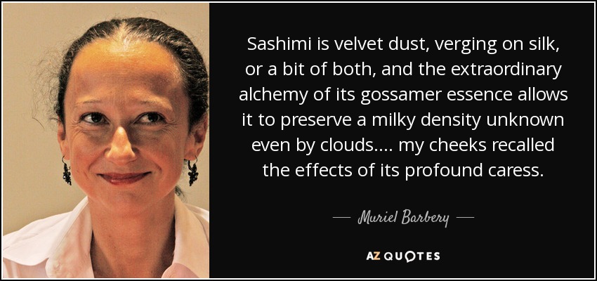 Sashimi is velvet dust, verging on silk, or a bit of both, and the extraordinary alchemy of its gossamer essence allows it to preserve a milky density unknown even by clouds.... my cheeks recalled the effects of its profound caress.