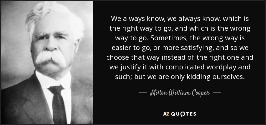 We always know, we always know, which is the right way to go, and which is the wrong way to go. Sometimes, the wrong way is easier to go, or more satisfying, and so we choose that way instead of the right one and we justify it with complicated wordplay and such; but we are only kidding ourselves.