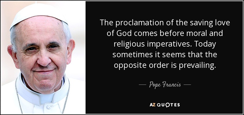 The proclamation of the saving love of God comes before moral and religious imperatives. Today sometimes it seems that the opposite order is prevailing.