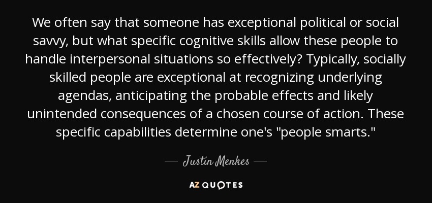 We often say that someone has exceptional political or social savvy, but what specific cognitive skills allow these people to handle interpersonal situations so effectively? Typically, socially skilled people are exceptional at recognizing underlying agendas, anticipating the probable effects and likely unintended consequences of a chosen course of action. These specific capabilities determine one's "people smarts."