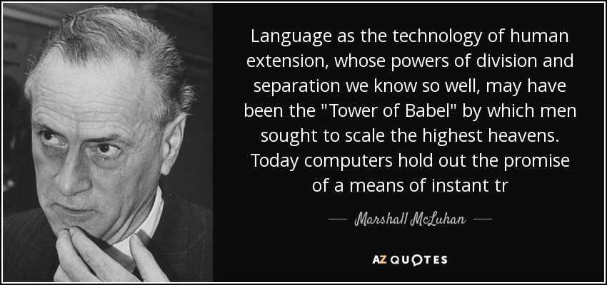 Language as the technology of human extension, whose powers of division and separation we know so well, may have been the "Tower of Babel" by which men sought to scale the highest heavens. Today computers hold out the promise of a means of instant tr