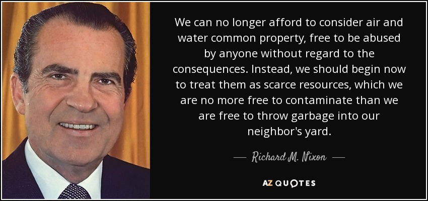 We can no longer afford to consider air and water common property, free to be abused by anyone without regard to the consequences. Instead, we should begin now to treat them as scarce resources, which we are no more free to contaminate than we are free to throw garbage into our neighbor's yard.