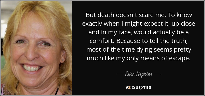 But death doesn't scare me. To know exactly when I might expect it, up close and in my face, would actually be a comfort. Because to tell the truth, most of the time dying seems pretty much like my only means of escape.
