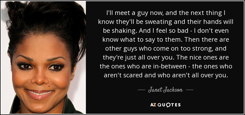 I'll meet a guy now, and the next thing I know they'll be sweating and their hands will be shaking. And I feel so bad - I don't even know what to say to them. Then there are other guys who come on too strong, and they're just all over you. The nice ones are the ones who are in-between - the ones who aren't scared and who aren't all over you.