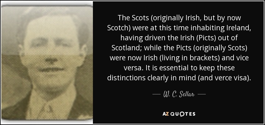 The Scots (originally Irish, but by now Scotch) were at this time inhabiting Ireland, having driven the Irish (Picts) out of Scotland; while the Picts (originally Scots) were now Irish (living in brackets) and vice versa. It is essential to keep these distinctions clearly in mind (and verce visa).