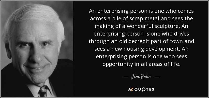 An enterprising person is one who comes across a pile of scrap metal and sees the making of a wonderful sculpture. An enterprising person is one who drives through an old decrepit part of town and sees a new housing development. An enterprising person is one who sees opportunity in all areas of life.